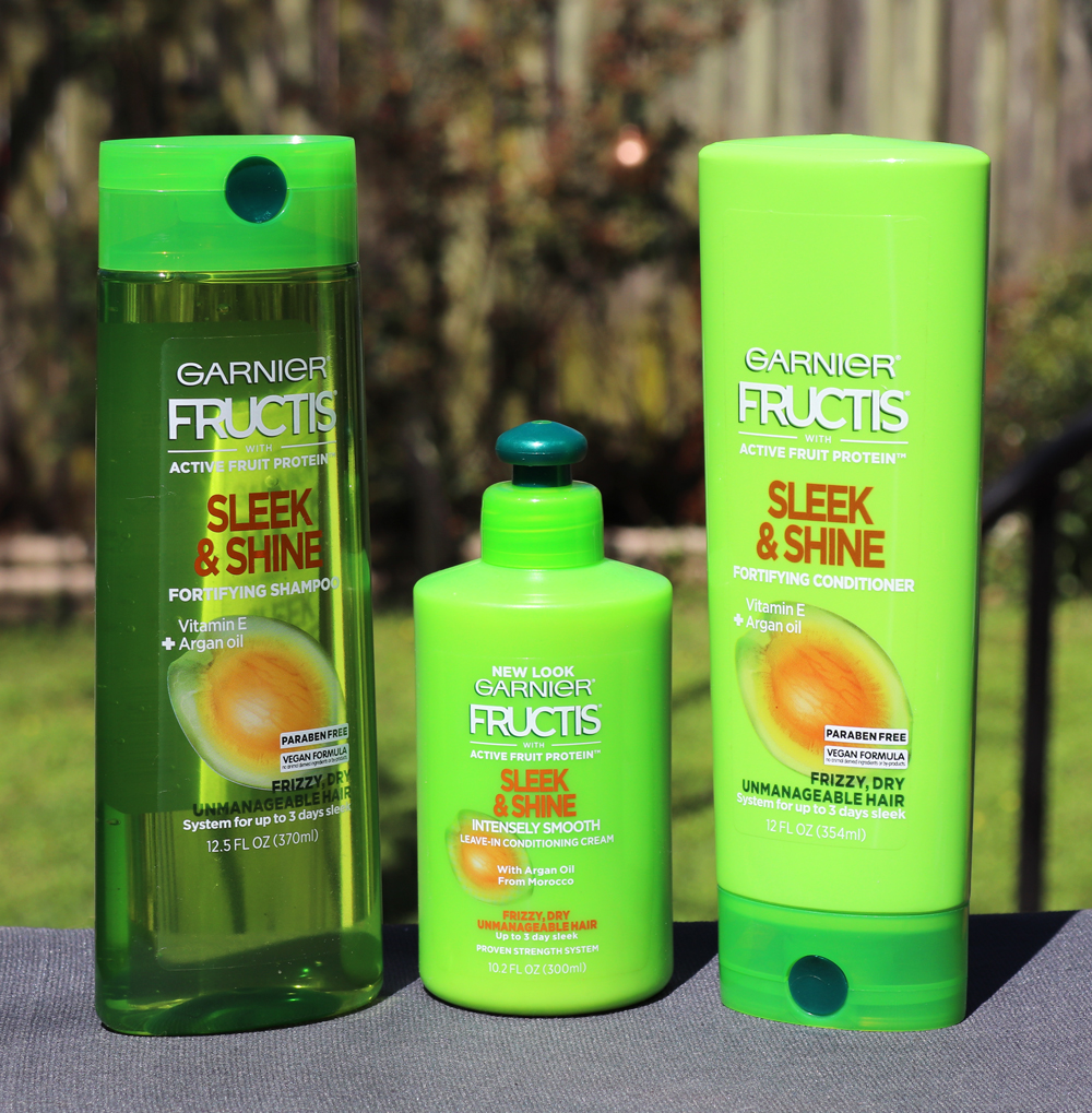 Anyway, Louisiana is known for many things – some good and some bad. One of the bad things is HUMIDITY! The fall and winter are not so bad, but spring and summer are FRIZZ CITY, especially for my fine, wavy hair. So, I was excited to try Garnier Fructis Sleek & Shine to see if it would help. I tried the Fortifying Shampoo, Fortifying Conditioner and Intensely Smooth Leave-In Conditioning Cream.