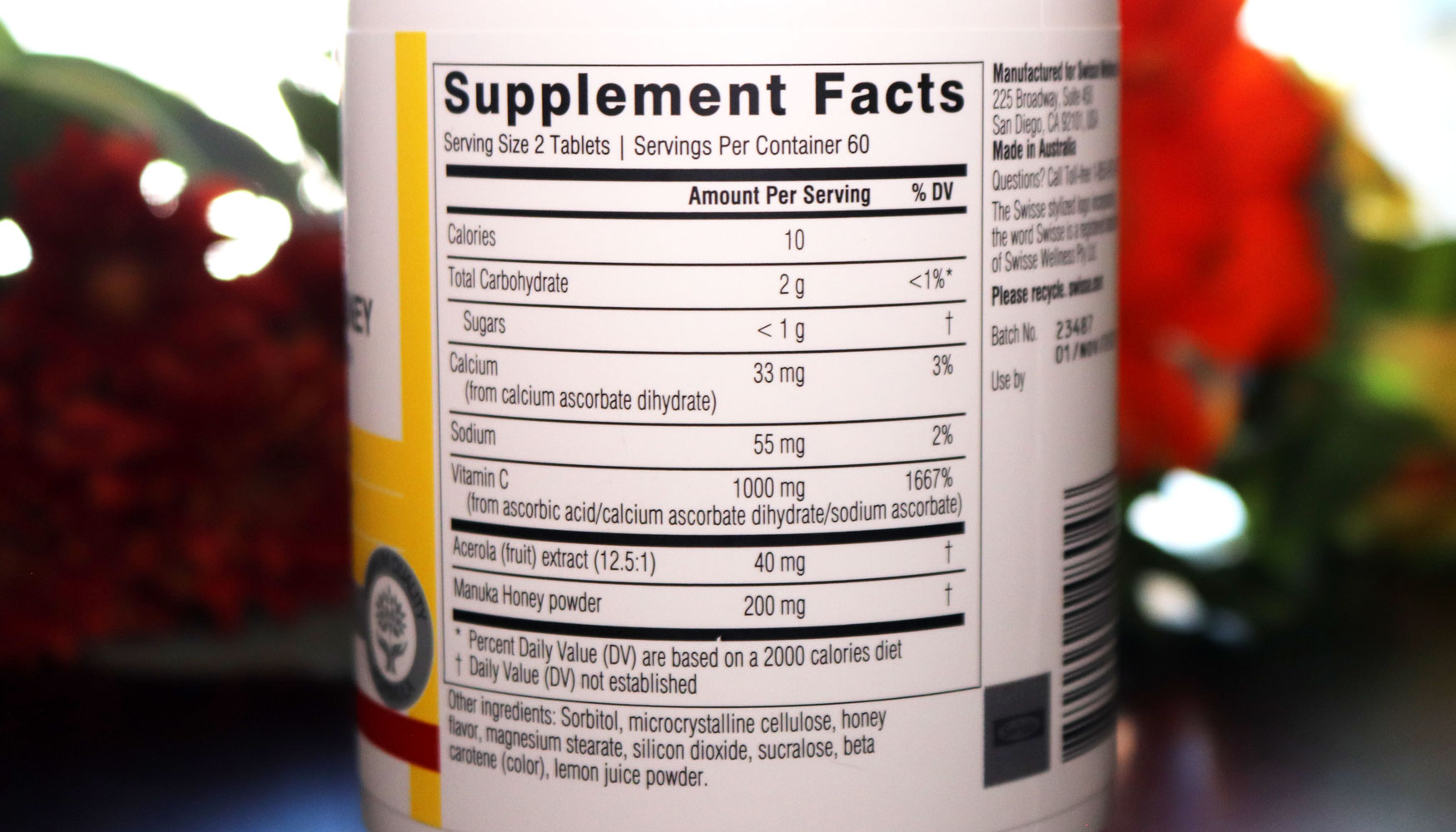 Swisse Ultiboost Vitamin C + Manuka Honey chewable tablets are a wonderful way to give your body a boost! They are honey and lemon flavored (a bit on the tart side), and each serving (2 tablets) have 1000 mg Vitamin C, 40 mg acerola fruit extract, 33 mg calcium, and 200 mg manuka honey powder. There is less than 1 gram of sugar per serving and 2 grams of carbs. Swisse sources their manuka honey from a cruelty free, sustainable source – the Taranaki region of New Zealand, where the bees are left in the native forest all year round.